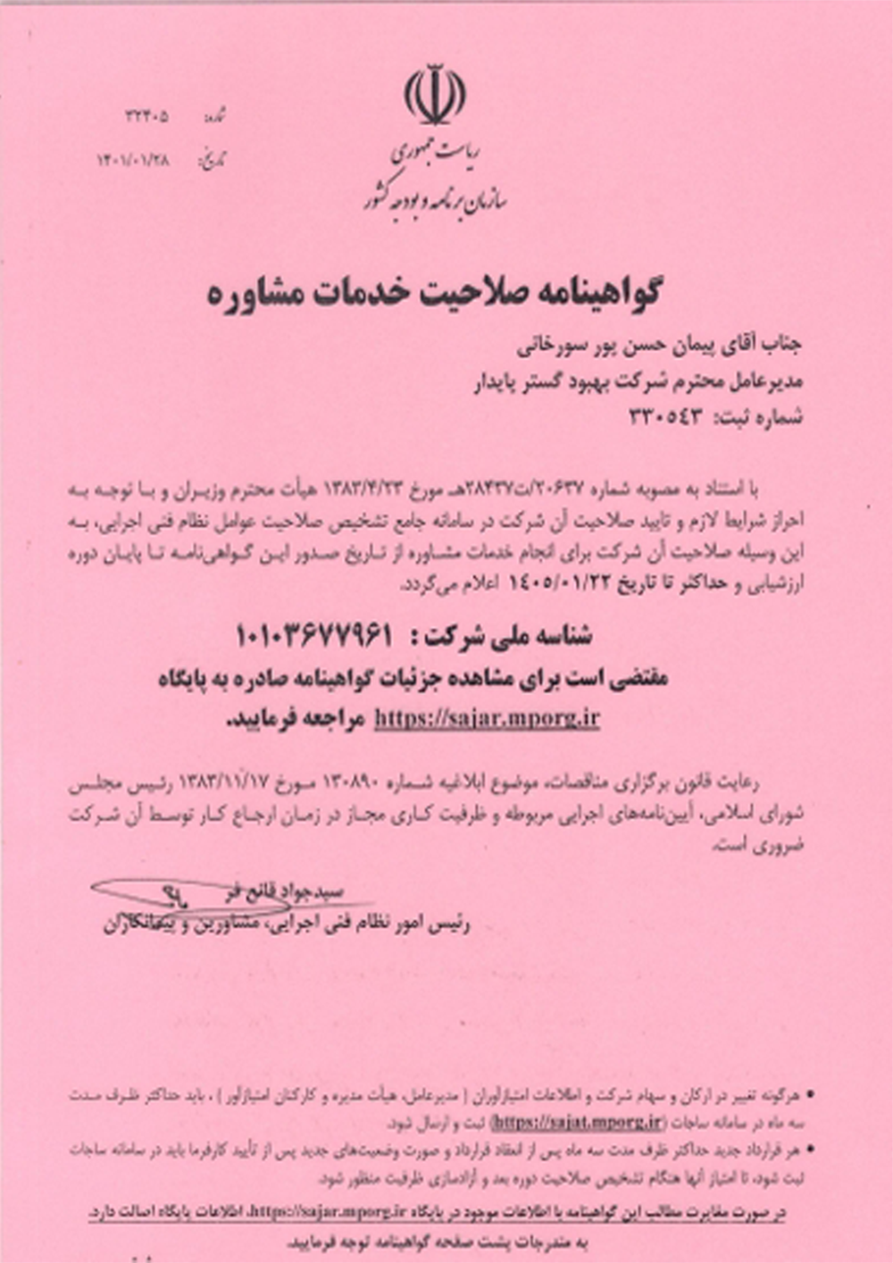 شرکت مهندسین مشاور بهبود گستر پایدار با تکیه بر استانداردهای جهانی و تعهد به کیفیت، موفق به دریافت چندین گواهینامه معتبر در حوزههای مدیریت محیطزیست، ایمنی و بهداشت شغلی و سیستمهای مدیریت کیفیت شده است. این گواهینامهها نشاندهنده پایبندی مجموعه به اصول توسعه پایدار، بهبود مستمر و ارائه خدمات مهندسی مطابق با معیارهای بینالمللی است.