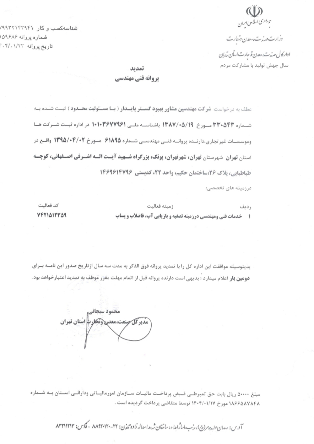 این شرکت دارای گرید 2 تخصصی محیط زیست ، رتبه 2 نظام مهندسی کشاورزی و منابع طبیعی و پروانه فنی و مهندسی از وزارت صنعت ، معدن و تجارت میباشد. تنها عضو ایرانی اتحادیه محیط زیست ایالت باواریای آلمان افتخاری است که نشان از پایبندی ما به استانداردهای ملی و بین المللی دارد .